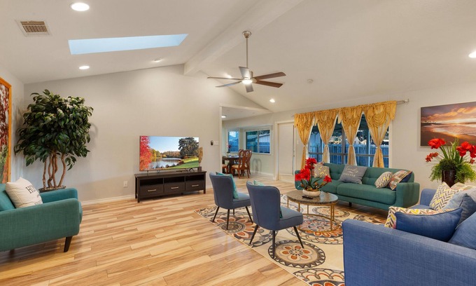 6. The large Living Room with the modern furnishings, a smart TV for the guests to unwind. It has a queen size sleeper couch, a loveseat and three decorative chairs. The multiple glass windows and the skylight are given the Living Room with the extra natural lightings.