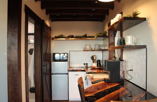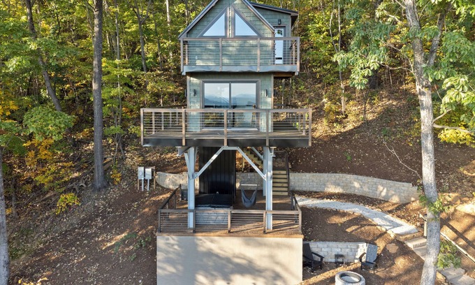 Rare Appalachian Treehouse Gem! Luxurious, one-of-a-kind retreat for couples. Elevated tiny house among the treetops, private parking, plush bedroom, sleek bathroom, beautiful kitchenette, loveseat, recliner, private double-level decks, fireside lounging (wood provided), gas grill, and patio with a hot tub! Surrounded by nature, with wineries, hikes, restaurants and shopping all nearby. Please come and relax and revel in the beauty of nature! 4WD is highly recommended.