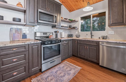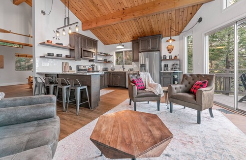 This beautifully remodeled 2 bedroom, 2 bath cabin is nestled high in the trees along a hillside with views of the forest and lake. Only a 5 minute drive to Lake Arrowhead Village and SkyPark at Santa's Village.