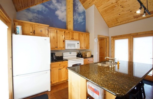 Designed as a vacation home, this cabin has two private bedroom each with a queen bed and private bathroom. It also includes a full kitchen and great room/dining area.