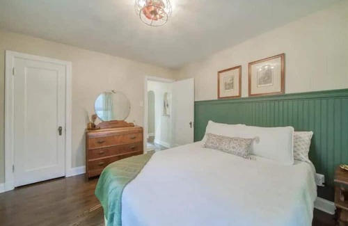 The Green Acres cottage boasts a large private driveway, enough for several vehicles. Enter through the gate of the fully fenced front and back yard and up the porch steps into the home. You’ll be greeted with a warm and inviting living, dining room, and work space. Grab a snack from the bowl and hang your jacket in the garment closet. The armoire has a smart tv, games, and playing cards. The comfortable velvet couch has storage under the chaise where you’ll find additional pillows and sheets. Some of the softest blankets are located in a floor basket and draped along the couch. Enjoy the remote lit lamp for a darker ambiance. The desk workspace is equipped with a Bluetooth speaker, filing basket and drawers where you’ll find extra USB cords. The dining area has four chair seating and a separate switch lamp over the table. Just off of the main living area is a small hallway leading to the bathroom and two bedrooms on either side. Soak in the tub and enjoy anything you may need including shower essentials, blow dryer, makeup towels and more. The hallway closet has a pac n’ play with mattress pad and sheets as well as other small items for children including a baby bath, toys, and nightlight. You will also find pet care items in this closet. Each bedroom has a queen sized bed, a dresser, closet, chair, and side table with lamp. The windows are treated with sun filtering pull down shades and curtains. In the closets you will find velvet hangers and a personal fan. Each bedroom is also equipped with a remote controlled ceiling fan/light. Going back through the hallway and into the main living area, you will find another walkway into the kitchen. First you will see a door which leads downstairs to the basement laundry room. In the laundry room you will find a washer and dryer and drying rack as well as vaccuum, mop, and broom on the wall. Located on the metal shelving, please help yourself to the ironing board, detergent pods, dryer sheets and extra care products. Back up to the kitchen you’ll find a pantry and a fully stocked cooking space complete with a dishwasher, spices, and a thorough coffee cabinet. Coffee, tea, creamers, and sweeteners are provided. Just bring your own groceries! Outside the home, the backyard is the perfect fenced area for your little ones or pets to play but if you need more space, located just behind the house and a short walking distance you will find Green Acres park and the Acorn Trail where residents enjoy two brand new playgrounds, a covered pavillion, baseball field, basketball court, sand volleyball court and tennis courts. The Acorn Trail traverses through more than seven miles of the city in a gigantic loop, connecting several parks and more than a dozen landmarks, perfect for exercise, kids, and pets.