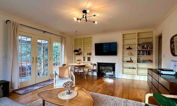 Beautiful sunny home nestled in an historic part of the village at the top of the hill. Relax in a quiet garden surrounding, just a short walk to restaurants, shopping, or many hiking trails. A pergola greets you as you walk into your private patio entrance. This attached two story apartment has two bdrms, 1.5 baths, a fully equipped kitchen, and a gorgeous living room that boasts a gas fireplace. Sip a warm drink while cozying up to the fire, listening to your favorite record on the Victrola!