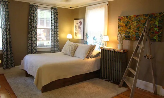 This spacious one-bedroom apartment is located in a restored house built in 1845. A colorful, cozy space that boasts tons of character with original honey-colored hardwood floors.