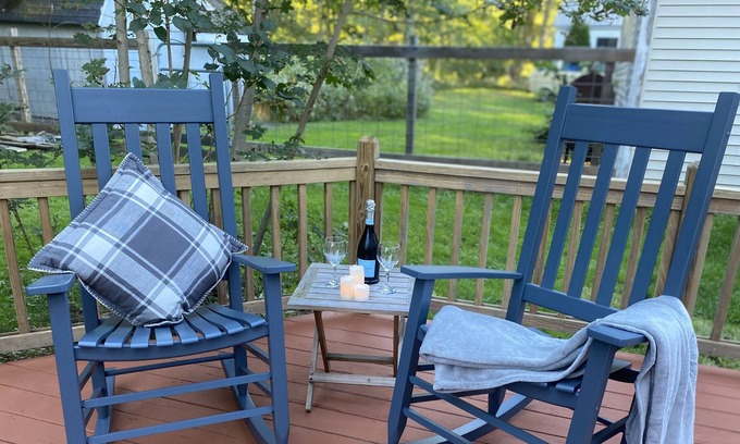 The cottage has a spacious deck and yard which backs up to woods. Downstairs is an open plan sitting, dinning room and kitchen as well as a small separate laundry room containing a washer and dryer. There are 2 bedrooms one with a King bed the other a Queen, there is also a small room adjoining the main bedroom which is equipped with a Twin bed.
