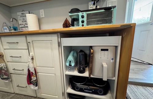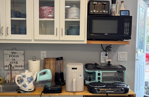 Welcome to our casita! Room to sleep 2 people w/private entrance & parking. Coffee pot, microwave, toaster oven, portable stove burners, air fryer, mini blender, George Foreman, tea pot, mixer, dishes, pots/pans, utensils; full size fridge/freezer; eating area/desk; bar stools; tv w/sound bar, WiFi; electric fireplace; HVAC system; 3/4 bath; & closet area. Queen bed on adjustable frame w/massager. The shower is best for someone under 5’11”. Guests can use our outdoor kitchen with bbq & patio.