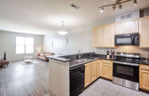Our spacious apartments feature inviting living areas, fully-equipped kitchens, and bathrooms complete with toiletries. Building amenities include a large outdoor pool (seasonal, open summer through Labor Day, closed in winter.