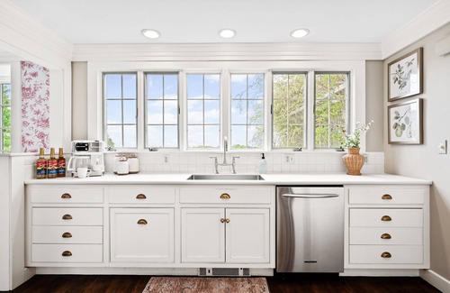 Enter the light filled eat-in kitchen with comfortable window seat overlooking rolling green lawns. The classic and updated kitchen is well-equipped with stainless steel appliances, a center island, and no shortage of counter space. Two sinks, two dishwashers and a double oven make this the ideal spot for a large group to cook. And if this wasn't enough space, walk over to the large butler's pantry for more room to prep.