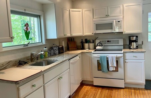This quaint North Conway Village home is sure to win you over; a bright and cheery spot, conveniently located within walking distance to shops and restaurants. If Cranmore is where you are looking to hit the slopes this winter, look no further! Your home away from home is just a minute, or two, away. North Conway is a perfectly central location to all that the Mt. Washington Valley has to offer. Just ask us! The entry level of this free standing home includes a full kitchen, dining area, comfy living room with TV, and a wonderful (fully enclosed) front porch. The second level includes the full bathroom, a bedroom with a bunk bed (two twins), a bedroom with a queen bed and extra large closet, and a third bedroom with a king bed. For added convenience, there is Tesla level 2 EV charger installed at the property. Please note, there is no washer/dryer on site, but if you must do laundry while on vacation, there is a Laundromat right down the street. This charming property is perfect for a visit during any season!