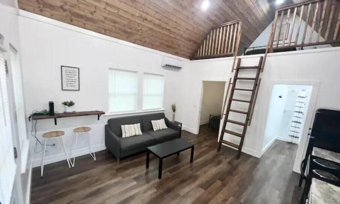 This tiny cabin is a two bedroom and 1 bath. Downstairs you have a spacious living room and kitchen that includes everything you would need for a comfy stay. Couch does fold out to sleep one adult. There is a bar table to eat or do your computer work at. The kitchen has a refrigerator, stove, microwave, drip style coffee maker and all the essentials needed to eat, cook and drink. The downstairs bedroom includes a full-size bed and cubical dresser. The upstairs bedroom is accessed by climbing the rustic ladder where you'll find another full-size bed. The bathroom is downstairs and is very roomy. It has a walk-in shower, toilet and vanity. The bathroom does come with a set of toiletries for your trip which includes; shampoo, conditioner, body wash, and lotion.