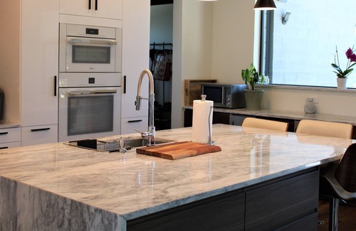 The extending glass dining table seats 8 comfortably and has views of the lake. 12 place settings are provided for your convenience, as well as cooking utensils, pots and pans, and a large range of glassware from martini to wine. The built-in wine cooler and ice maker ensure that you will never be far from a glass of chardonnay or a chilled cocktail.
