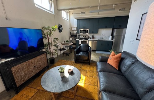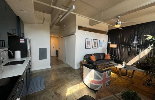 Welcome to Creative Corner, a fully furnished rental that blends creativity with modern design in a historic tobacco factory. Ideal for traveling professionals, innovators, and thinkers, this unique space features a striking escalator mural and U.S. patent artwork. Enjoy reliable high-speed Wi-Fi, in-unit laundry, and access to amenities like a rooftop lounge, pool, fitness center, and rock climbing wall in this gated, self-contained community.