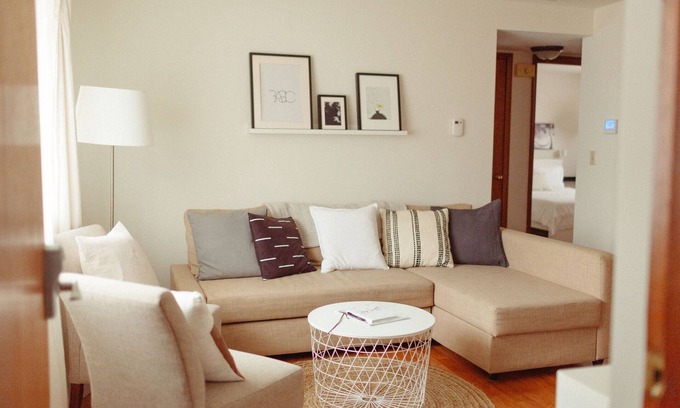 This flat was created to bring peace and simplicity. This is reflected in the modern and simple design that can be found throughout. You walk into an open and clean, plush living space, and pass through into a modern efficient kitchen and dining table for four. The front bedroom is welcoming with its straight lines and comfortable queen bed, the back bedroom has a second cozy queen bed. A spacious bathroom with a shower and tub. Giving couples, friends, business travelers, and families everything they need for an overnight or extended stay.