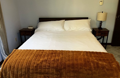 The Master has a king bed and on suite with a jacuzzi tub, usb enabled lamps at bedside, tv, and dresser.