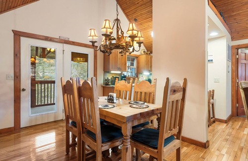 Your immersive experience into this natural wonderland continues even indoors, where warm wood trim and accents combine with rustic-chic décor to create a desirable cozy cabin atmosphere. Host a family movie night in the living room while relaxing on comfortable sofa and armchair seating. The seasonal fireplace will keep you warm and toasty in the cooler months, fostering an ambiance that inspires togetherness. The country-style kitchen is well-equipped for all your mealtime needs, offering ample counterspace and cabinetry stocked with cookware and dining ware. Gather the crew for formal meals at the dining room table with seating for 6, or head out onto the spacious screened-in deck to take your meals al fresco amongst the sights and sounds of the surrounding landscape.