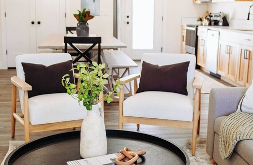 On the main floor, you walk in to an open concept living room, dining area, and kitchen. There are two bedrooms on this floor and one bathroom that will be locked off. Upstairs, we have a futon that sleeps one in another living space that has a TV. There is a bathroom up here, as well as one bedroom that has a king sized bed. There will be no one else staying in the unit with you. We provide a 1 bedroom option for these units to appeal to all of our guests!