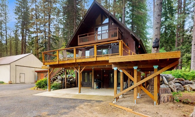 Welcome to your perfect mountain escape! Nestled in the woods just outside the charming Bavarian village of Leavenworth, this cozy creekside cabin offers a peaceful getaway with Camas Creek flowing right through the property.
