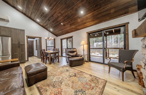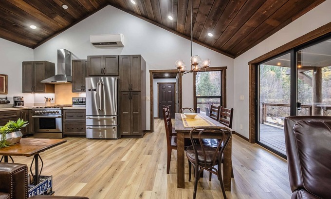 At the home, begin your mornings on the deck overlooking the creek, sipping your fresh cup of coffee while you soak up the fresh air and plan out your agenda for the day. Indoors, vaulted, wood-paneled ceilings create those perfect cozy cabin vibes, sitting atop open spaces curated to maximize rest and relaxation. Sink into the plush leather sofa and recliner seating in the living room while you stream all your favorite shows and movies on the smart TV, the gas fireplace keeping you warm and toasty during the colder months. Steps away, the modern kitchen comes fully equipped for all your mealtime endeavors, showcasing stainless steel appliances and contrasting dark wood cabinetry stocked with all the comforts of home.