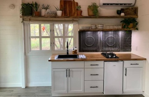 Creekside Cabin is located 7 miles north of Hico, right off of Hwy 220 on your way to/from DFW. It is set in the most relaxed setting on the Duffau Creek. Surrounded by nature, you will enjoy all 277 square feet of this unique beauty. There is a queen bed, a couple of chairs in the bedroom to relax in and a dining table with chairs.