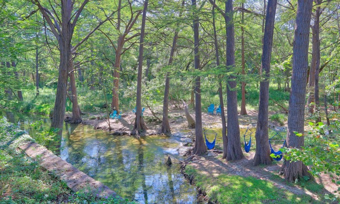 As the day begins, head to the kitchen to brew your morning cup of joe. Pick up some pastries at a local bakery for breakfast and step out onto the patio to marvel at the beauty of a cool Hill Country morning. The back porch at Creekside Cottage is a private oasis. Take in the amazing atmosphere as the creek ripples below, the birds chirp near the bird feeder, and the breeze rustles the trees. Take a stroll down to the Cypress Creek and become mesmerized as the clear water flows over the stones and giant cypress roots. On a rainy day, relax under the overhang and listen to the rain pitter-patter on the tin roof.