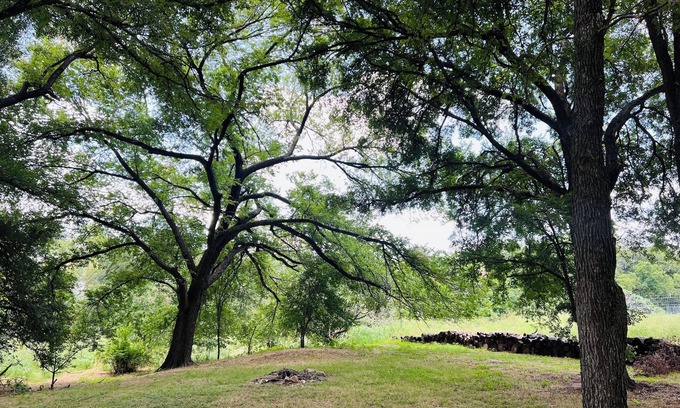 The property is just under an acre. There is a fire pit and hammock, and trails down to the creek with access to fishing and wildlife viewing (including turtles, armadillos, and abundant large-mouth bass).