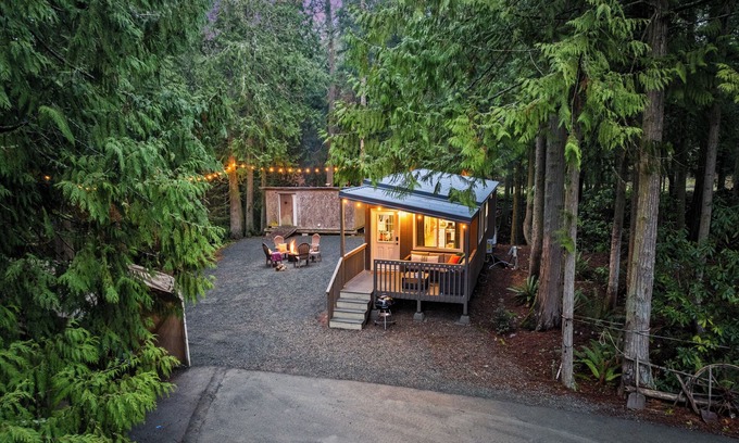 Discover a perfect getaway in this new, spacious tiny home surrounded by nature. Nestled in a tranquil forest with the gentle sounds of a babbling creek just behind the house. Designed for couples or small groups, this cozy and luxurious retreat offers a fully stocked kitchen, plush queen bedroom and a rollaway twin bed, comfortably sleeping up to three guests.