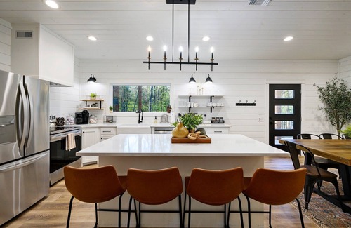 Vaulted ceilings and floor-to-ceiling windows flood the great room with light. Relax on plush seating in front of the seasonal gas fireplace, stream your favorite shows on the large Smart TV, or enjoy fast Wi-Fi throughout the cabin.