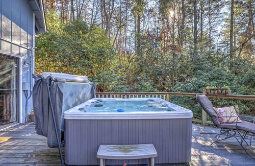 Open the sliding glass doors in the living room to hear the rushing waters of Town Creek. The deck has a lovely sitting area with an outdoor gas fire pit. The hot tub is in the perfect spot to see the creek, surrounding woods and twinkling stars! There is a fire pit in the yard below the deck for the times a wood fire is just desired. The brand new staircase makes access to the creek fast and easy. Close to the creek you will find a deck with chairs and a side table large enough for snacks and a sliding settee for yet another perspective of the cabin and water.