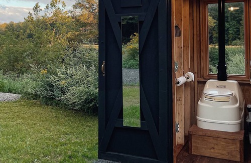 This camp has a private 1/2 bathroom with composting toilet outhouse and a hand washing station. There’s also a small pump sprayer to clean off dishes etc. No running water/shower.