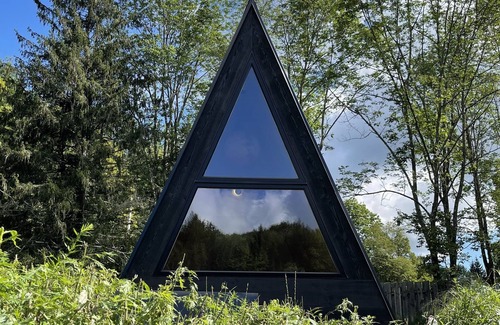 Glamp on the Charlotte Creek in a newly built modern tiny a-frame. Sleep under the full moon. A giant moon light hangs over the bed(s) with a stunning reflection in the window at night over the creekview. Perfect for a romantic getaway, fishing trip, or glamping spot with friends in the Catskills. There’s a private driveway on site.