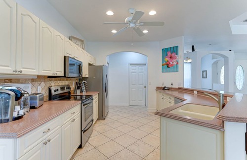 From the caged pool area you have a view of the North Creek and our boat dock. The kitchen is fully equipped with dish washer, microwave, stove and oven, coffee machine, juicer, slow cooker and much more. In the laundry room there is a washing machine and a dryer and in the 2 car garage you will find beach chairs, umbrella and a cooler.