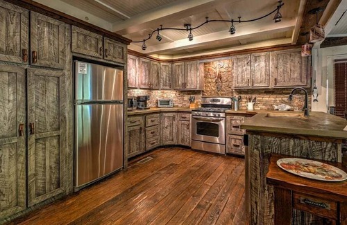 For inside cookery, you'll find everything you need to make gourmet meals in the custom-built kitchen, which features natural wood cabinetry, natural stone countertops, a stacked stone backsplash, stainless steel appliances, and conveniences like a Keurig and coffee maker, microwave oven, blender, toaster, and crockpot. The beautiful granite dining table accommodates four to six.