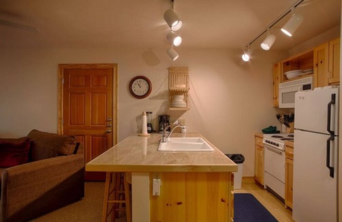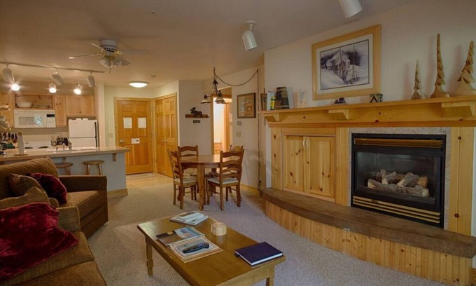 This condo is an end unit and nearest the hot tubs, with easy access to a back patio with ample deck seating. A large bedroom is positioned just off the main living area. The kitchen includes every amenity needed to prepare a delicious home-cooked meal with ease. The dining area seats four people at the table with an additional three stools at the bar. Enjoy a movie or your favorite TV show from either the bedroom or the couch in the living room which includes a gas fireplace. After a long day of hiking, or shredding the slopes, you can soak in the community hot tubs.