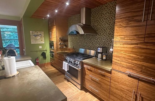 This kitchen is a chef's paradise where you can cook while enjoying your friends and family as they sit at the kitchen bar, or take their beverage outside. Adjacent to this spacious and easy to use kitchen you will find your access to the outdoors. The east facing deck has a large dining table and grill, and you can enjoy a lovely meal in cool comfort once the sun has passed over the house. If it gets at all chilly it he evening there is a gas deck heater available for your use. In the morning, the deck is cool and the sounds of the creek create the perfect backdrop for enjoying a cup of coffee.