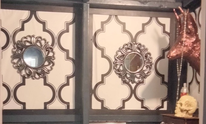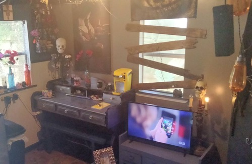 This is a one of a kind space nestled under large oak trees and secluded behind your very own privacy fence! This is perfect for a Halloween lover, as we have a coffin as a closet, a Ouija board coffee table! Not for the faint of heart!