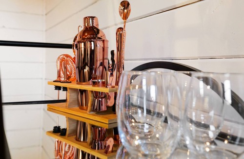 We also feature a kitchen stocked with all cooking essentials, a complete cocktail making set with a recipe book, a propane BBQ grill, smart 65" TV where you can log into Netflix, Hulu, Amazon & Youtube. We have a smart lock with codes that are changed for each guest to ensure your security, as well as a security camera facing the front of the property. Even if it's raining, you can enjoy the outdoors under our large covered porch with a patio set & a comfortable swinging bed!