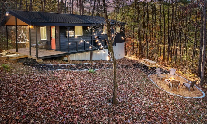 The cabin is set on 2 acres of wooded land with plenty of space for privacy. For entertainment we supply board & card games. There is a beautifully crafted fire pit area outside lit by twinkle lights, including chairs & a picnic table! We also provide s'mores roasting sticks so you can properly relax with a treat by the fire.
