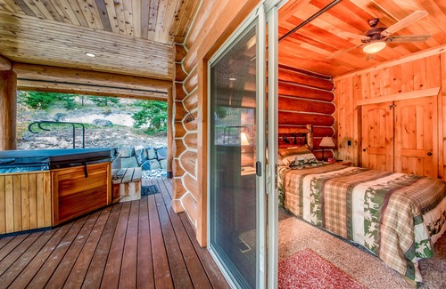 There's plenty of sleeping space with a total of 5 bedrooms with queen beds. On the 2nd floor entertainment room there are 2 sets of bunk beds (4 twin beds), futon, and couch. The home's outdoors theme continues into the bedrooms and bathrooms with extensive use of custom log and natural wood furniture.