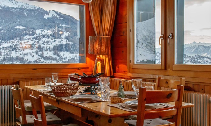 "Crettamour", 5-room chalet 170 m2 on 3 levels. Comfortable and tasteful furnishings: entrance hall. Living/dining room with open-hearth fireplace, cable TV and DVD. Exit to the terrace. Open kitchen (oven, dishwasher, 4 ceramic glass hob hotplates, toaster, kettle, microwave, electric coffee machine, Capsules for coffee machine (Nespresso) extra, raclette grill, fondue Set (cheese)). Shower/WC. Heating. On the lower ground floor: 1 room with 2 beds (75 cm, length 190 cm). 1 room with 1 french bed (1 x 160 cm, length 200 cm). 1 room with 2 beds (90 cm, length 190 cm). Bath/WC. Upper floor: 1 room with 2 beds (90 cm, length 190 cm). Balcony, north facing position, large terrace, west facing position. Terrace furniture, barbecue. Very beautiful view of the mountains and the valley. Facilities: washing machine, dryer, children's high chair, baby cot for up to 2 year olds. Internet (WiFi, free). Parking (2 cars) at 50 m. Please note: non-smokers only.