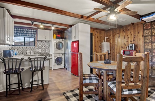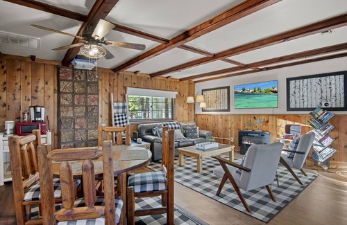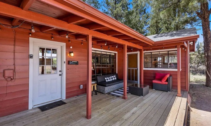 Hidden two-bedroom, one-bath gem in the tall pines close to historic Downtown Flagstaff shops & restaurants, NAU, Route 66, parks & hiking trails. Upgraded retro appliances, central heat & air conditioning, fully fenced yard with outdoor furniture, front porch, BBQ, Adirondack chairs, fire pit, and picnic table. Living room sofa and club chairs. One king bed and one queen. SmartTVs in the living room and bedrooms w/speedy 1-gig WiFi. Full-size washer/dryer. Parking for two cars.