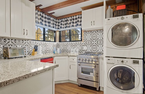 The fully equipped kitchen features hot rod red appliances, including a gas range and hood, dishwasher, Keurig coffee maker, microwave, and classic refrigerator. The new washer and dryer are full-size.