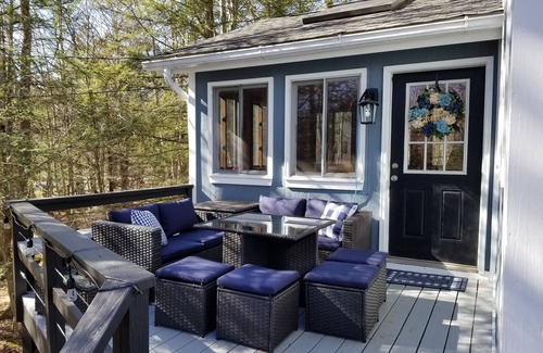 2nd floor (main floor) has a beautiful spa Jacuzzi tub in the bathroom (not a hot tub), Bedroom with smart TV, desk, queen size bed and a large closet. The kitchen has stainless steel appliances with an eat-in bar counter with stools. Coffee bar with a dual Keurig coffee maker. The kitchen comes fully equipped with cooking and eating utensils. The sun room has a picnic table great for kids and 2 outdoor camping chairs you can use to take to the beach, The dining room has a large table that seats 8 people. Living room has a large comfy couch , one chair, smart TV and a real wood burning fireplace (firewood is not supplied). Off the main floor is a Large outdoor deck with plenty of seating and a propane Gas BBQ that is hooked up to a big tank in back of the house, fire table with its own small propane tank ..