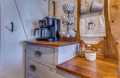 The Kitchen and Dining area are tucked behind the living room and the kitchen is fully stocked with cookware, dishes, appliances, etc. The Kitchen has the cutest little coffee nook where you can brew your favorites. The Dining area is part of the kitchen and has sliding doors out onto the deck where you can enjoy your meals al fresco at the outdoor dining table or grill your favorite meat on the gas grill. The deck has a seating area as well and is that perfect spot for that cup of coffee.