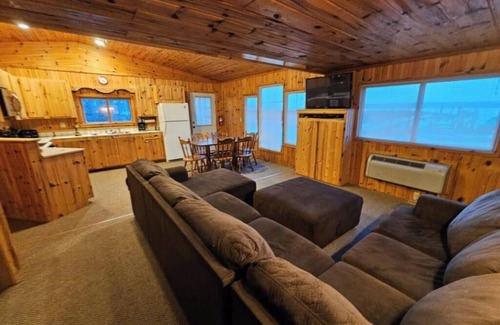 Experience ultimate comfort in our spacious 3-bedroom cabin, 2 bedrooms featuring a cozy queen bed and the back bedroom with 2 full beds. With two 3/4 bathrooms, air conditioning, and Dish TV, this cabin offers all the amenities you need for a relaxing getaway. Located just 65 feet from the water, enjoy stunning sunset views right from your doorstep. Perfect for family vacations or a retreat with friends!
