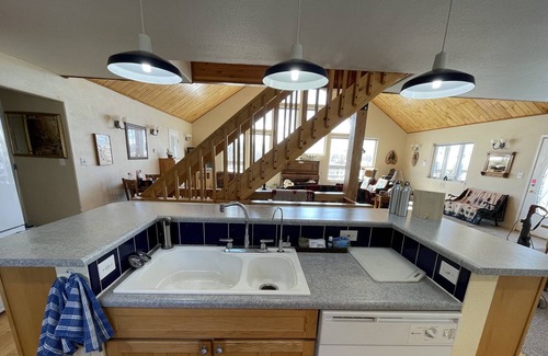 Ample kitchen with bar seating, large dining room, and a connected living room allow you to take in the views from every room. 3 bedroom, 3 bathroom home sleeps 12 comfortably with room to spare. Large main floor bathroom has soaking tub, walk in shower, and spacious vanity.