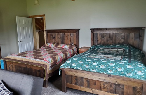 The Lodge has one master bedroom with an ensuite on the main floor, and four large bedrooms upstairs. The two front bedrooms overlook the lake, while the two back bedrooms have ladders to lofts for the kids to play in. There's two full bathrooms upstairs - each shared between a front and back room. No pets in the lodge.