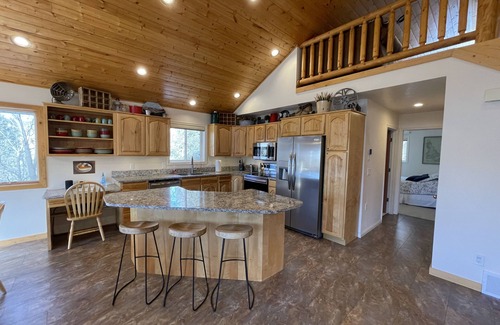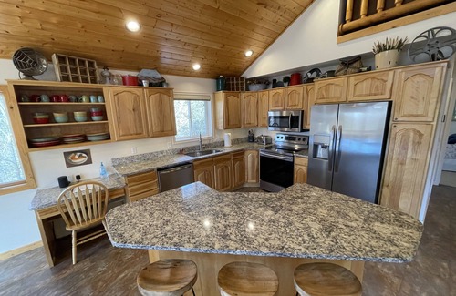 After an action-packed day spent exploring Idaho’s great outdoors, return to 'The Hideout' to cook a delicious meal in the fully equipped kitchen, which is complete with all the culinary appliances you’ll need to bring your favorite recipes to fruition. When dinner’s ready, gather around the large wooden dining table, with seating for 8, to devour the tasty home cooked fare. Additional barstool seating can be found at the kitchen island, ensuring that there’s room for everyone in your travel party to enjoy meals together.