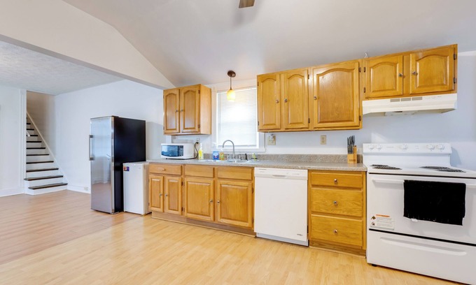 Ideally situated for travel nurses and remote workers, this 2-bedroom, 1-bath vacation rental in Cumberland, MD, invites you to explore the outdoors. Lush state parks, pristine fishing spots, and serene kayaking routes are moments away, while UPMC Western Maryland is only 3 miles from your door. Back home, an open interior featuring a fully equipped kitchen, multiple workspaces, and a covered porch with sunrise views awaits. While here, be sure to visit the Western Maryland Scenic Railroad!