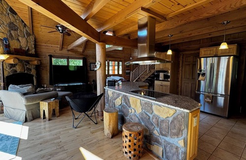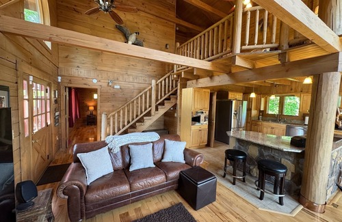 This impressive and modern log cabin features soaring ceilings and a relaxed layout. The main living area, kitchen, laundry room, ½ bath, and master bedroom suite are easily accessed on the main floor, which also features a wrap-around covered porch and expansive back sundeck for taking in the views of beautiful Lake Cumberland. Spend evenings relaxing with the family and enjoying alfresco meals on the deck using the six-person table and chairs or move to the firepit for smores and storytelling on a chilly evening.