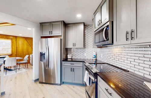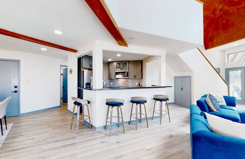 Inside this beautiful home, discover a host of updated amenities, colorful decor, and mid-century modern sensibilities. Brew up your morning coffee or prepare full-course dinners in the sparkling, contemporary kitchen complete with stainless steel appliances and a breakfast bar. Dine together indoors or meet up around the picnic table on the lower-level patio for an unmatched alfresco experience. After meals, take a seat in the main living area where you can stream all your favorite channels.