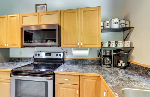 KITCHEN: Stainless steel appliances, electric range, microwave, dishwasher, fridge, toaster, drip coffee maker, bakeware, dishware & flatware, spices, high chair, dining space